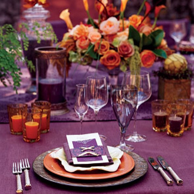 Orange and purple can me such a great combination for table setting. Image source Brides.com. #partyideas #partystyling #partyplanning #partystylist #eventdesign #wedding #weddingideas #inspiration #weddingphotography #diyparty #diywedding #beautiful #thepartyatelier #tableideas #tablescape (at www.thepartyatelier.com)