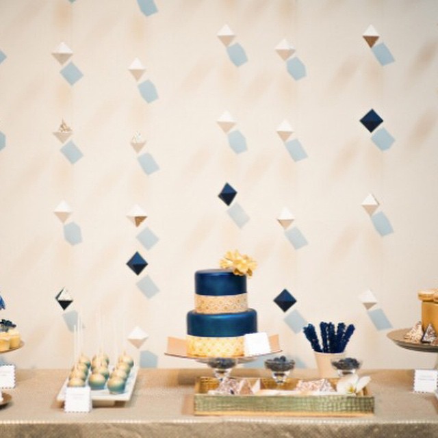 Loving the hanging decorations and details of this navy blue and gold dessert table. Image via Brit.co #partytable #partyideas #partyplanner #partystyling #partyplanning #desserttable #cake #eventplanner #wedding #weddingideas #inspiration #weddingplanner #weddingphotography #diyparty #diywedding #beautiful #thepartyatelier #delicious #dessert #navyblue (at www.thepartyatelier.com)