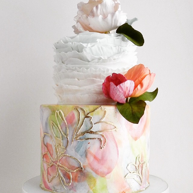 Loving the ruffles, the watercolor and hand painted details of this cake. Image source unknown. #weddingcake #wedding #cake #sugarflowers #weddinginspiration #pretty #love #cakedesign #bride #weddingplanning #weddingideas #sugarart #weddingphotography #thepartyatelier (at www.thepartyatelier.com)